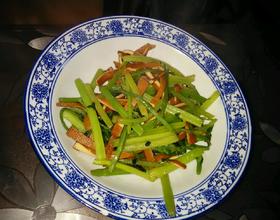 翻炒大约半分钟,加入豆干,继续翻炒几遍,摊平在锅内,可以静下心来等待大约三分钟。(期间加少许盐,翻炒5此次,加入半碗水)