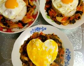炒好的番茄菜,码放到饭的一圈即可……这个菜要是也码放成爱心型就更完美啦!!看图片时发现有点美中不足啦!!