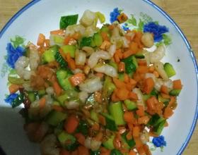 接着放入红萝卜,红萝卜断生时放入黄瓜,最后放入虾仁,翻炒,加入适量老抽,盐,鸡精,十三香调味,出锅