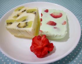 - 5. 奶液温热时倒入玻璃碗中凉透(苹果味的放入草莓,香橙味的放猕猴桃),放在冰箱里冷藏3至4小时