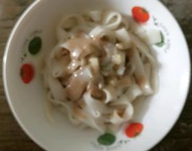 - 9. 再把面条盛碗里,上面浇上芝麻酱,拌一下,就可以吃了