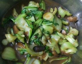 放入油,放入葱爆香,预放香茹,酱油,糖,勾老。放入油菜,盐。完成