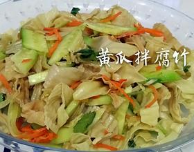 - 7. 用适当的容器将黄瓜,腐竹皮,香菜,胡萝卜,葱姜蒜,盐,鸡粉,味精,陈醋,白糖分别放入,点香油拌匀!(要适量少许,尝口调味)