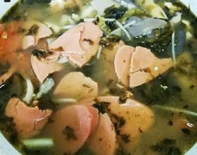 加入黄豆芽,磨菇,番茄,火腿肠,肉片煮十分钟