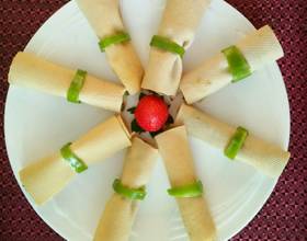 将卷好的干豆卷用尖椒圈要轻轻套上,不要用力,否则尖椒圈易断。