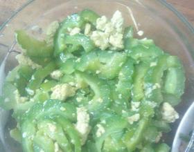 下油起锅,煸蒜香,下苦瓜爆炒,至5分熟,下蛋汁,翻炒,大火收汁,起锅。