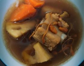 依次将焯好的小排、莲藕、胡萝卜及煲汤料放入陶瓷盅内,加满水,就可以开始炖啦