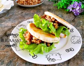 烙饼的面和的软一些,烙出来的饼更好吃,酱肉末里放些汤汁会更好吃,配菜可以根据个人喜好随意搭配。吃肉夹馍的时候女儿说也可以将除了生菜叶之外的其它配菜搅拌在一起,然后一起夹入饼中,再夹上生菜叶,会更简单,我觉得可行。