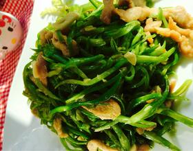 热锅凉油,放入肉丝煸炒,加少许料酒,葱姜煸炒。