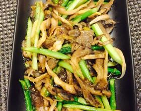 平菇洗净攥干水分撕条,芦笋削皮洗净切段