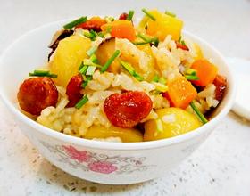 - 2. 土豆,胡萝卜去皮切小丁,香肠香菇切小丁;香菇要提前泡发,湿香菇就不用泡了;