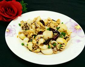 锅内热油,爆香干辣椒,倒入墨鱼仔中即可。