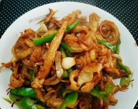 开大火下牛肚丝爆炒半分钟,烹入料酒继续翻炒,加入生抽,老抽盐炒匀