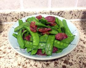将荷兰豆掐去两头后洗净,腊肠切片备用。