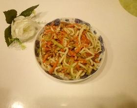 锅热后加入腌制的瘦肉,中火翻炒两分钟加入胡萝卜,胡萝卜变黄后加入青瓜和香菇,闻到青瓜香味扑鼻时加入乌冬面和均匀倒入鸡蛋,不停翻炒一会直至起锅,避免粘锅。