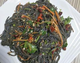 把,所有的食材放在上面,加入少许盐,鸡粉,捞汁,把炸香的红椒段,和油泼在上面