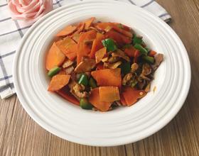 胡萝卜快熟了以后再放入青椒翻炒,放盐和酱油调味。