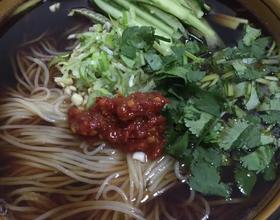 - 10. 将煮熟的冷面放入调好的汤中 放入切好的蔬菜 放入辣椒酱