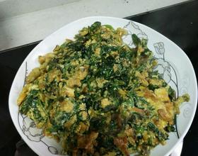 芹菜叶炒软炒越来越少。放鸡蛋。