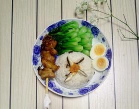香菇切成小片,待米饭半熟时加入,同时在米饭中添加适量的油和盐。  - 3. 锅热后放入适量的油,油起了加入蒜头翻几下,然后加入青菜,大火爆炒5分钟,菜梗熟了就起锅。