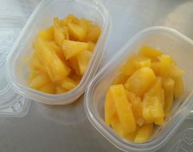 - 6. 带出汁后,菠萝变软稠,关火,装保鲜盒晾凉后,放入冰箱冷冻(冷冻时间按自己需求而定,冷冻主要也是为保鲜,久存。)