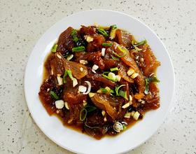 从超市买一袋海蜇头,清洗干净,把水控干装盘备用。