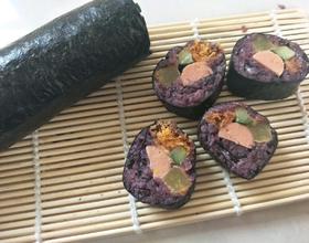 - 2. 将拌好的黑米饭均匀的铺在海苔上面,不要铺满,前面留些空。