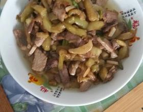然后葱姜炸锅,放肉!肉熟了之后,放过完油的茄子!然后放调好的蒜末酱油,再放少许盐,放入适量蚝油,翻炒几下,之后出锅!