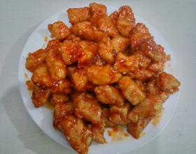 - 5. 少许油爆香葱花,加入酱汁,搅拌使其沸腾,倒入鸡块翻炒,使其挂汁均匀。撒上白芝麻,出锅。