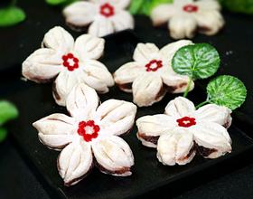 包好的点心胚正面向上放在面板上,轻轻按一下,使其表面平坦,樱花为五瓣,先用刀在坯子上分割成三等份,中间位置不要切断。