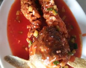锅上火添油 油温6成热下鱼炸金黄捞出 ,锅留底油放葱蒜炒香到入番茄酱 加白糖白醋黄瓜丁炒香 ,倒入水 用湿淀粉勾芡成汁,浇在炸好的鱼上即可上桌。
