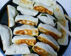 电饼铛刷层油,码好饺子,然后倒小半碗水,盖好开始锰,等到水几乎干的时候,开盖煎,三面都成金黄色即可出锅