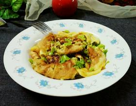 小火煎至一面金黄,大部分都膨松成块时翻面,小心别让蛋过于碎。