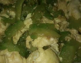 (凉瓜切薄片用一小勺盐腌制30分钟,鸡蛋打开并且搅拌均匀)准备完毕。锅烧干水后,倒入香油,接着将鸡蛋倒入油锅,翻炒两分钟,装盘。