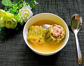 调馅时不用搅拌上筋,因为糯米本身带有粘性,馅酿入苦瓜在锅里煮时会自然粘在一起了,苦瓜在酿时用筷子把馅戳实一点。
