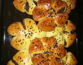 - 3. 将发酵好的面团拿出排气,然后分成8个大小相同小面团,把面团压扁至圆形包入红豆沙搓圆后压扁,用刀划出5个口,涂抹蛋液晒上芝麻