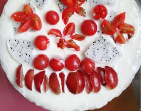 - 7. 倒入十寸模具,放中层160度,烤50分钟,烤好后把淡奶油和白糖打发后抹在蛋糕上,然后摆上水果就好了