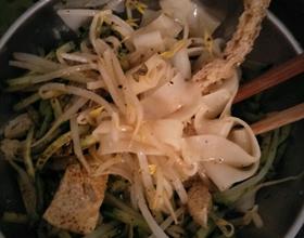 - 5. 把晾好的面皮切好,依次放入凉皮,面筋,绿豆芽,黄瓜丝,加入调味料,爱吃辣的可以多放点油泼辣子
