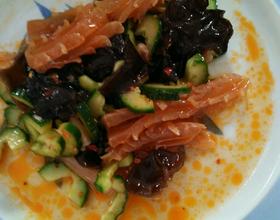 取一个拌菜盆,倒入黄瓜 木耳 鱿鱼花加盐,白糖,鸡精,味精水,香醋,花椒油,香油,生抽,蒜泥,搅拌均匀,装盘即可!