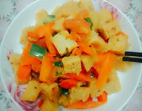 放入少量油,倒入胡萝卜青椒翻炒,哦,忘了说,准备一颗西红柿,切块,和胡萝卜一起炒,依次放入花椒粉,盐,十三香