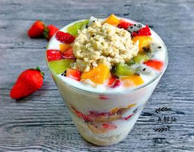 把水果去皮切成小丁,即食燕麦片加入碗中,加沸水烫至浓稠备用
