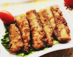 腌制好的带鱼取出裹上淀粉,尽量裹均匀一点。