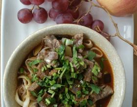 - 11. 待水开后,下入面条,煮制面条熟后,过凉水。(胃不好的人不用过凉。)然后放入碗中,加入炒好菜拌匀,再在面上放上适量牛肉(牛肉是我提前用高压锅压制熟烂的。)淋上热汤。撒上葱花,香菜即可实用。