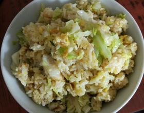 将包菜炒熟,乘出。将锅加热倒油放入米饭翻炒至热,打入鸭蛋继续翻炒