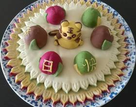 - 14. 再把黄色的两块面团揉成团粘在一起。巧克力面团做上肢和腿。红小豆做眼睛,用黄色和巧克力2种颜色做耳朵和尾巴。做一只小老虎。