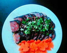 - 6. 第六步:把熬好的辣椒油慢慢的倒在摆好的猪血圆子上面撒上之前准备的葱及少量白芝麻,最后把之前煮好的胡萝卜摆在猪血圆子旁边,这道菜就完成了