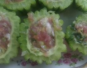 把陷放入苦瓜内,如图,用勺子安压一下!放入冰箱冷藏。用油煎炒闷即可!