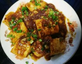 倒入调料,翻炒,随后放入煎好的豆腐,翻炒至汤汁浓时起锅。