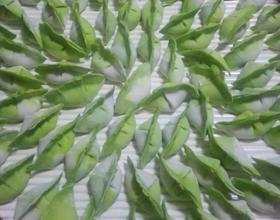 将白色的面团搓成长条,绿色的面团搓成长条包在白色长条面外面,按紧(这一步忘了拍照了),揪成小剂子,擀成皮。