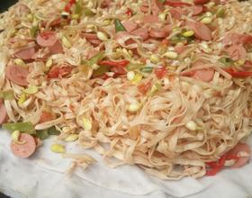 把锅里蒸好的面条用筷子抄出和炒好的菜拌均